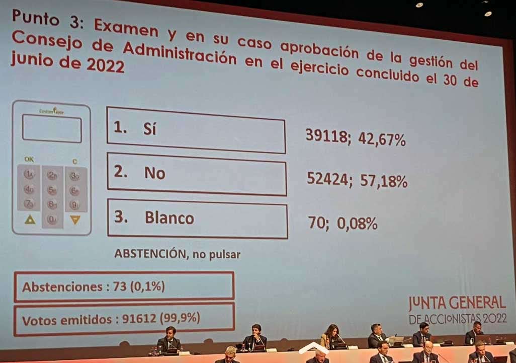 En la siguiente imagen aportamos un ejemplo del funcionamiento de la abstención en una Junta General de una Sociedad Anónima Deportiva (SAD) cuyos Estatutos regulan expresamente el "voto en blanco":